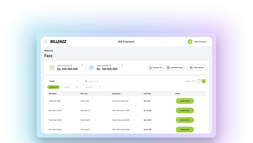 Integrasikan sistem langsung dengan API BillFazz untuk mengelola transaksi dalam volume besar dengan reliabilitas tinggi. Cocok untuk platform dengan kebutuhan teknis yang kompleks.